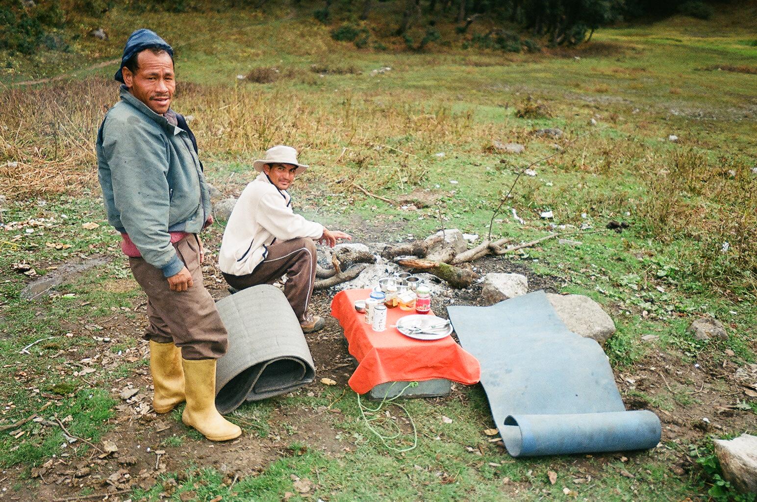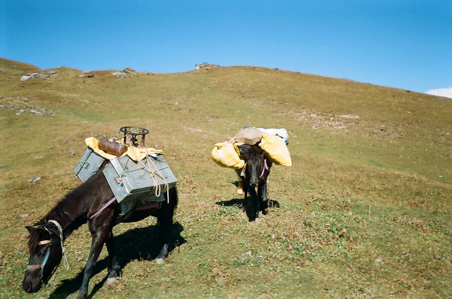 One of the porters wore his pants tucked into rubber boots twice the size of his feet. He weighed about 90 pounds, but could probably carry both horses fully loaded up the mountain. All day he talked to the horses in Hindi.