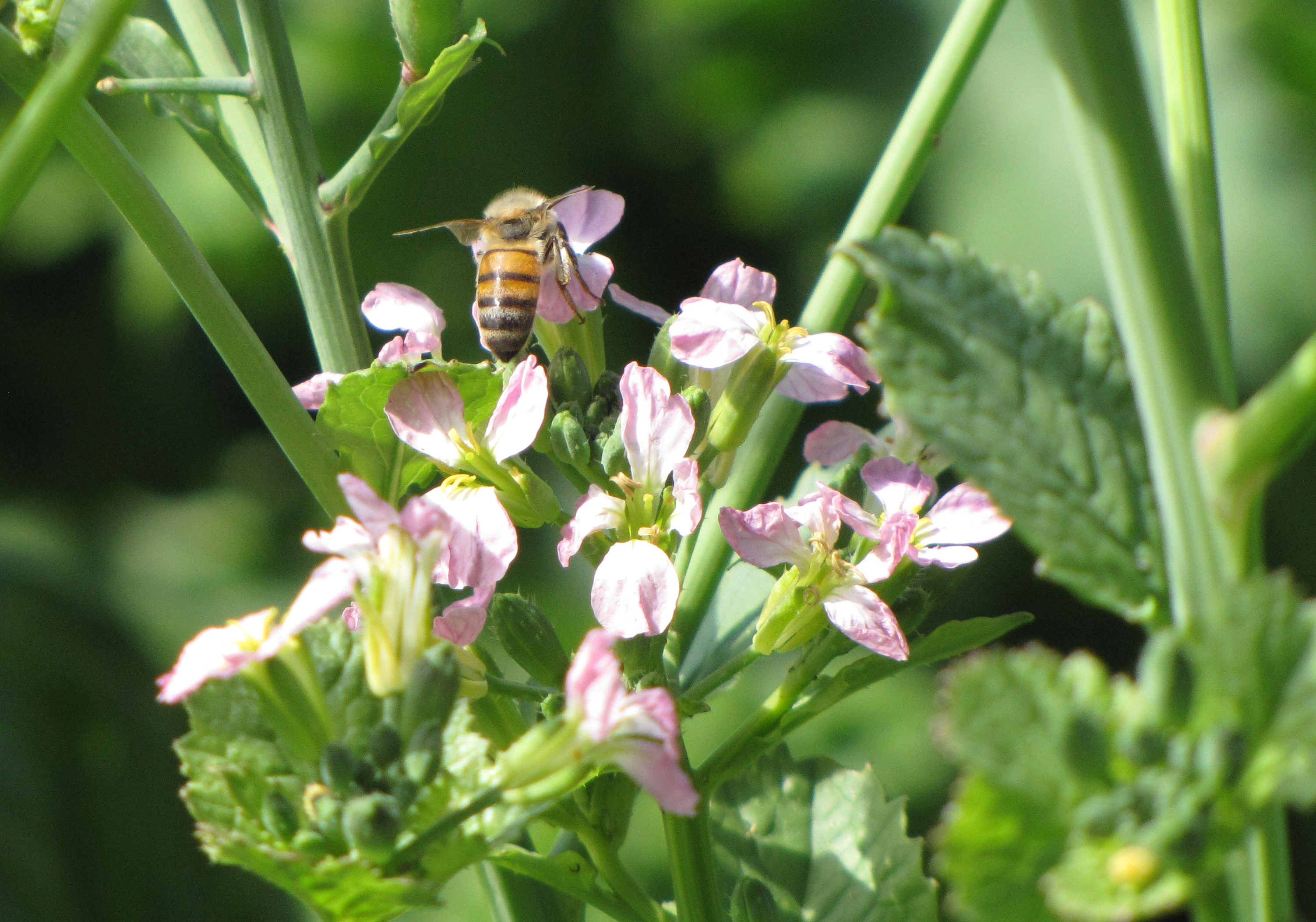 Mature radish plants offer a brilliant display of pink, purple, and white flowers, and radishes are the one plant we can count on to flower in the coldest weather, even when they are covered with frost. The flowers serve as a beacon to draw bees and beneficial predators into the garden, especially when they are the only flowers blooming in the bleak winter landscape.